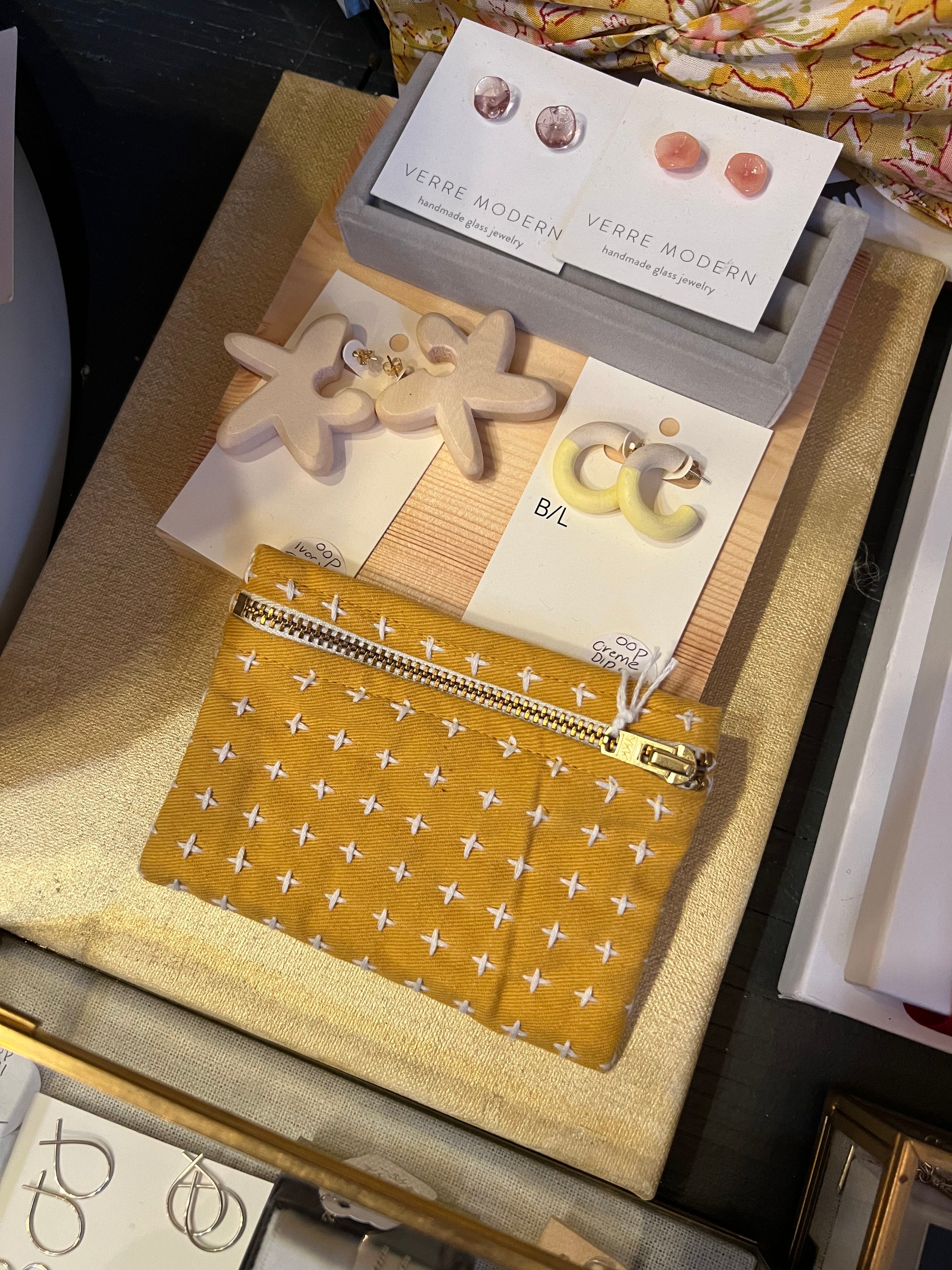 This small zip pouch is perfect to store loose change, business cards or even your headphones. Handmade from organic cotton, this charming pouch features a gold-tone zipper accented with tiny cross-stitch detailing against a bold background. Select one of each to visually organize your small items.