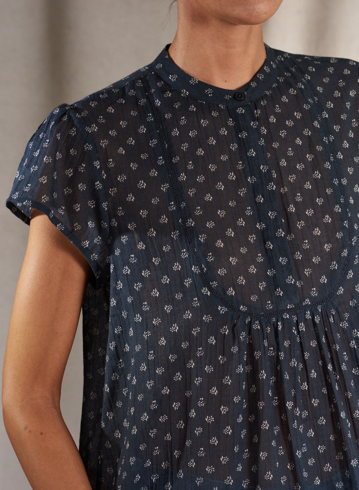 A delicate mini floral print top is detailed with gentle gathers, a capped sleeve for a casual paired down feel. You can wear it loose or tucked in with your favorite denim.