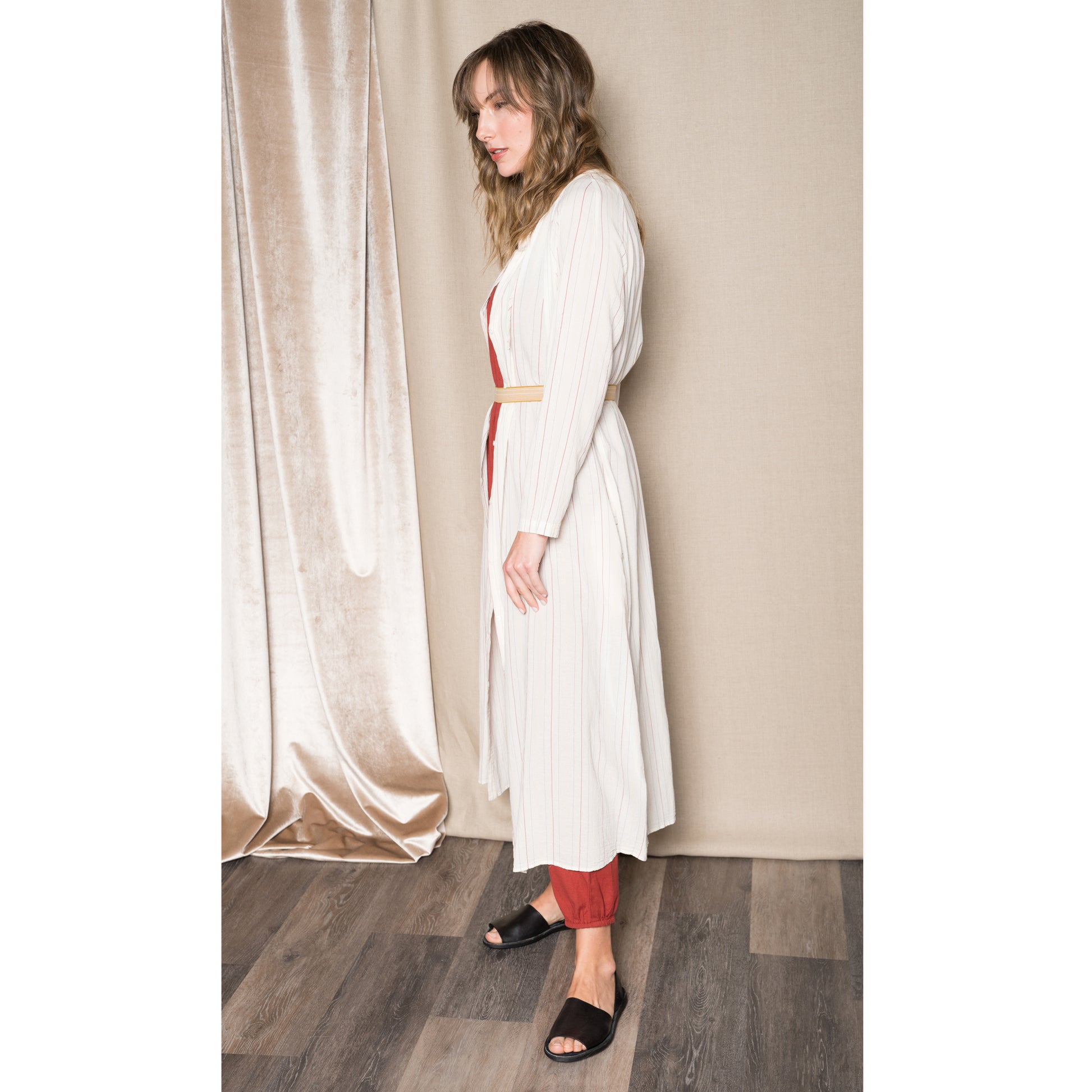 Humanoid RICKY long dress is light and airy. Button front shirt dress in a warm weather loving fine viscose and cotton blend. A coordinating belt creates a cinched waistline and adds a special touch. Versatile to suit your style. Plus, side seams pocket. 64% viscose 36% cotton. Made in Bulgaria with Italian fabric.