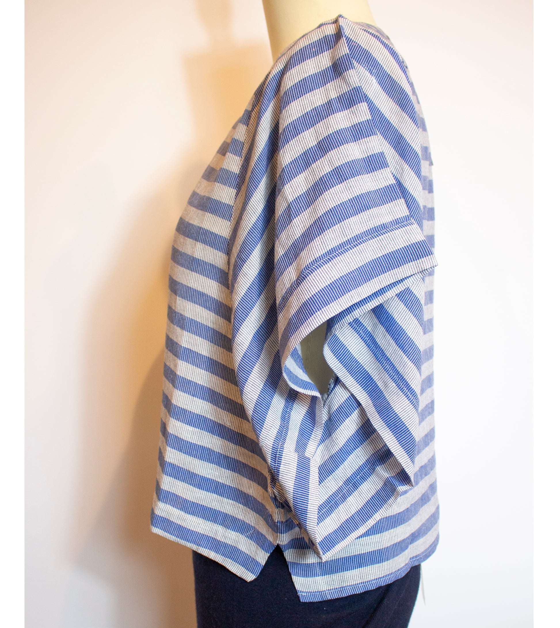 The WAYO is a boxy top with a relaxed fit that is given an elegant touch with the wide, draped sleeves. The top is made from a lightweight linen blend and has a slit with a button at the front.