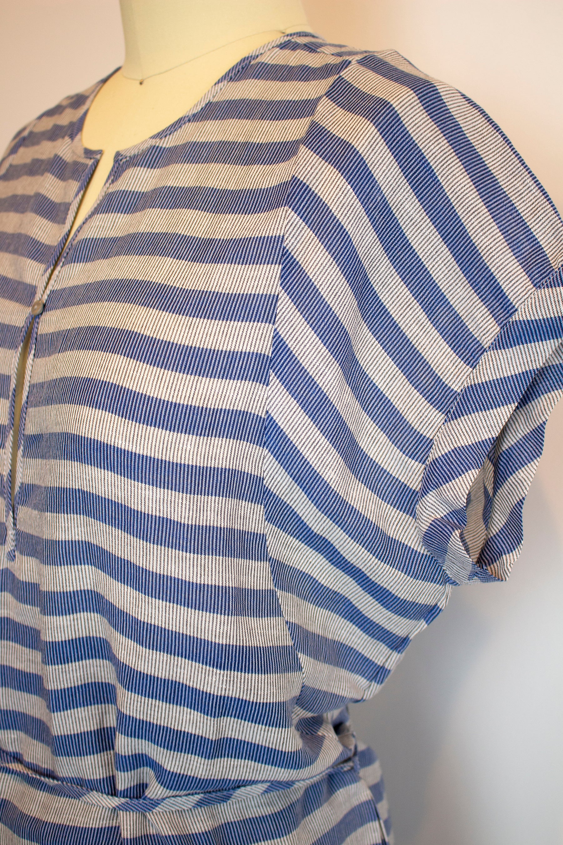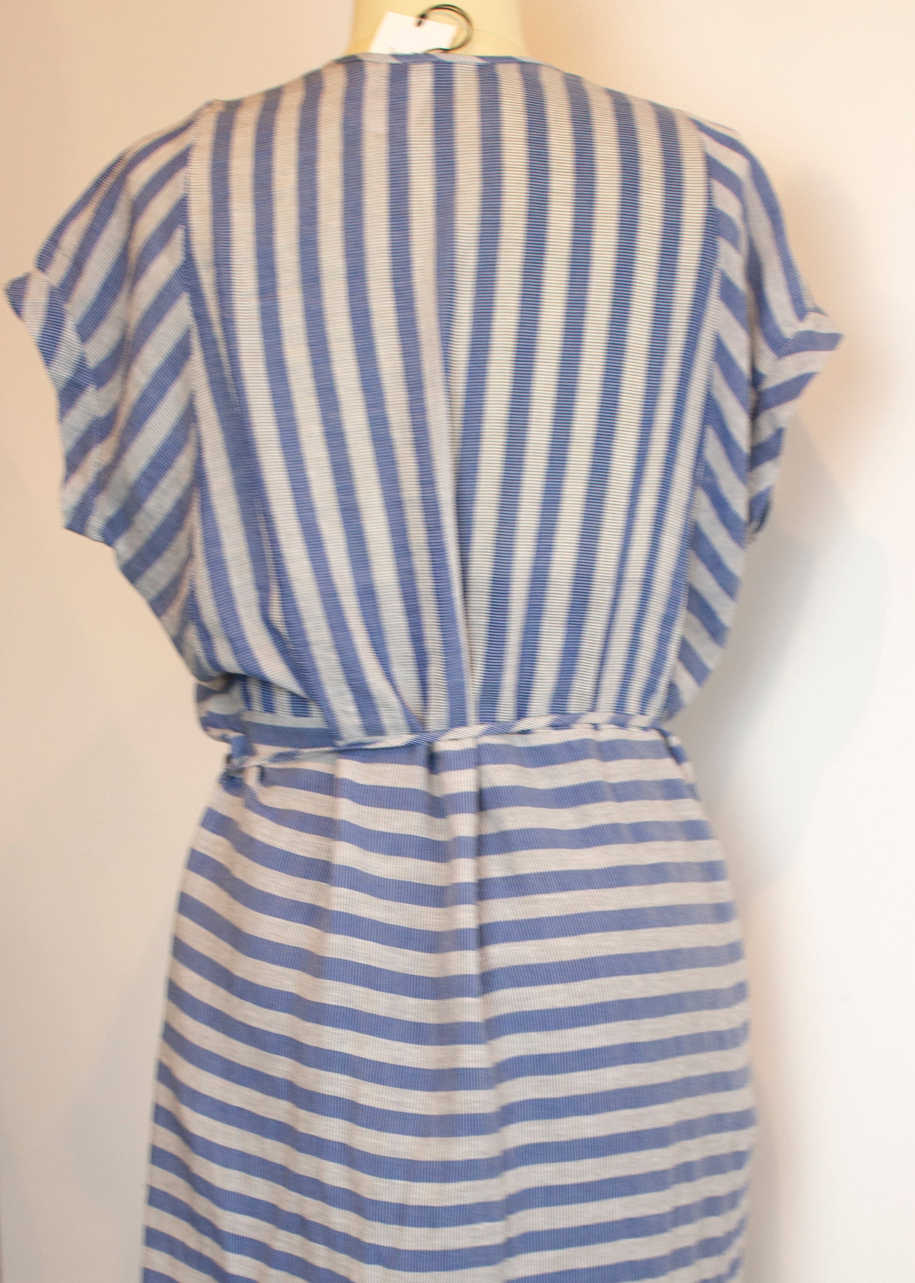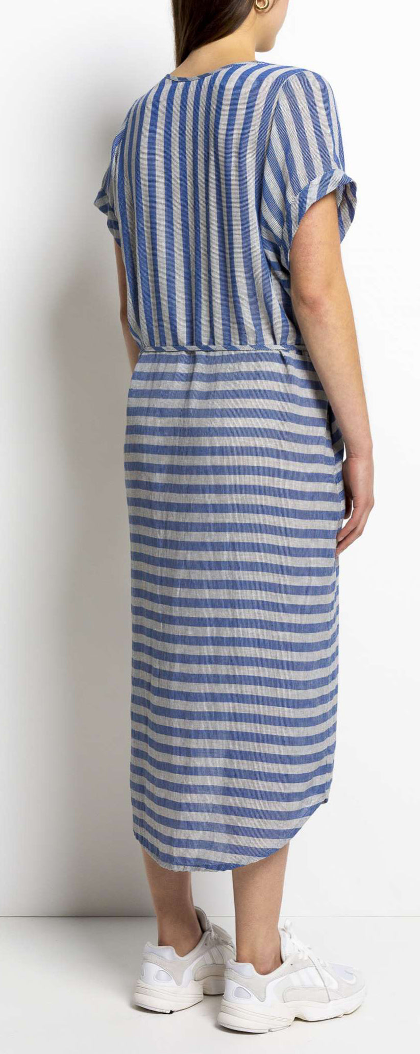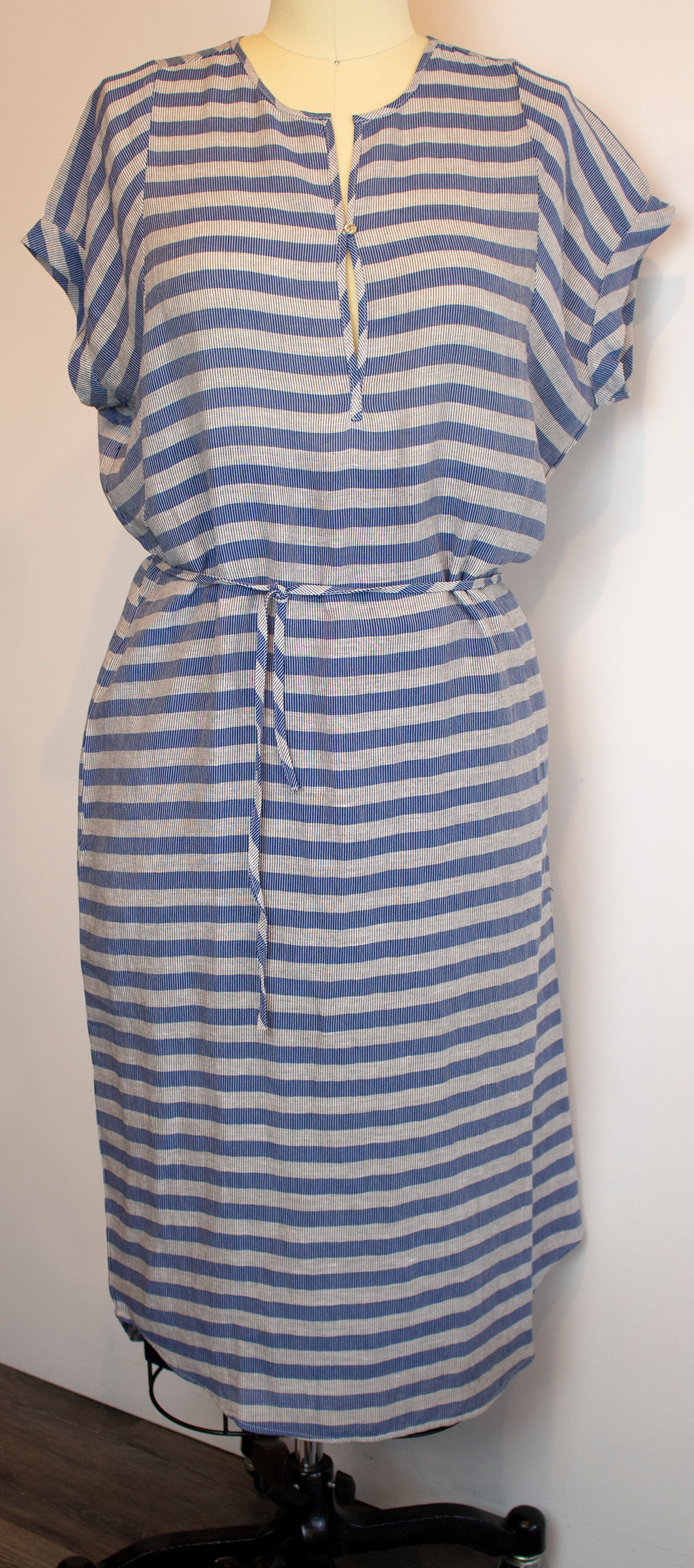 a comfortable dress with a relaxed fit that is given an elegant touch with the thin belt. The dress is made from a lightweight linen blend that falls to just below the knee.