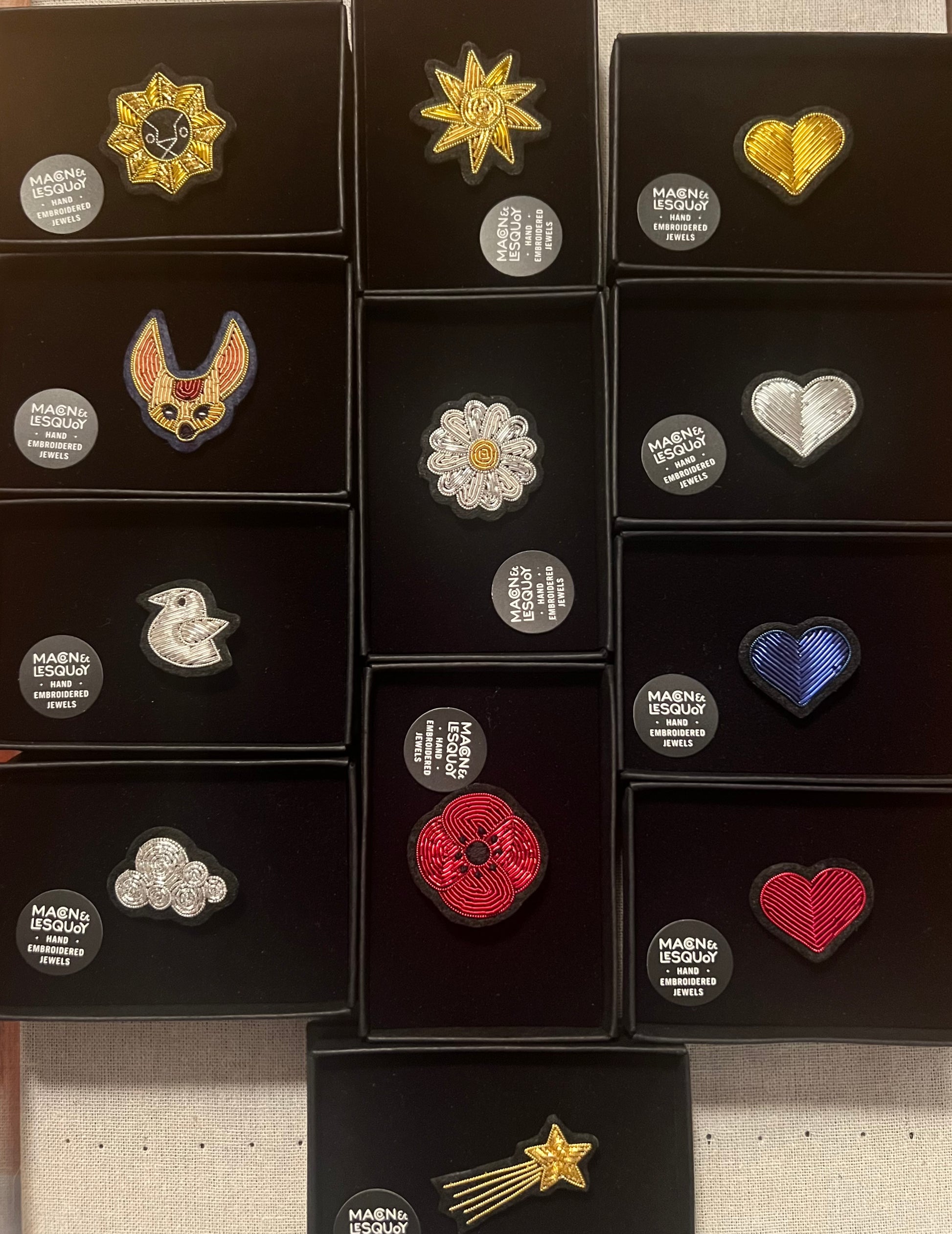 •Parisian designed and embroidered with care in Pakistan. Elegant brooches are the essential accessory. Store them their cardboard and velvet boxes.
