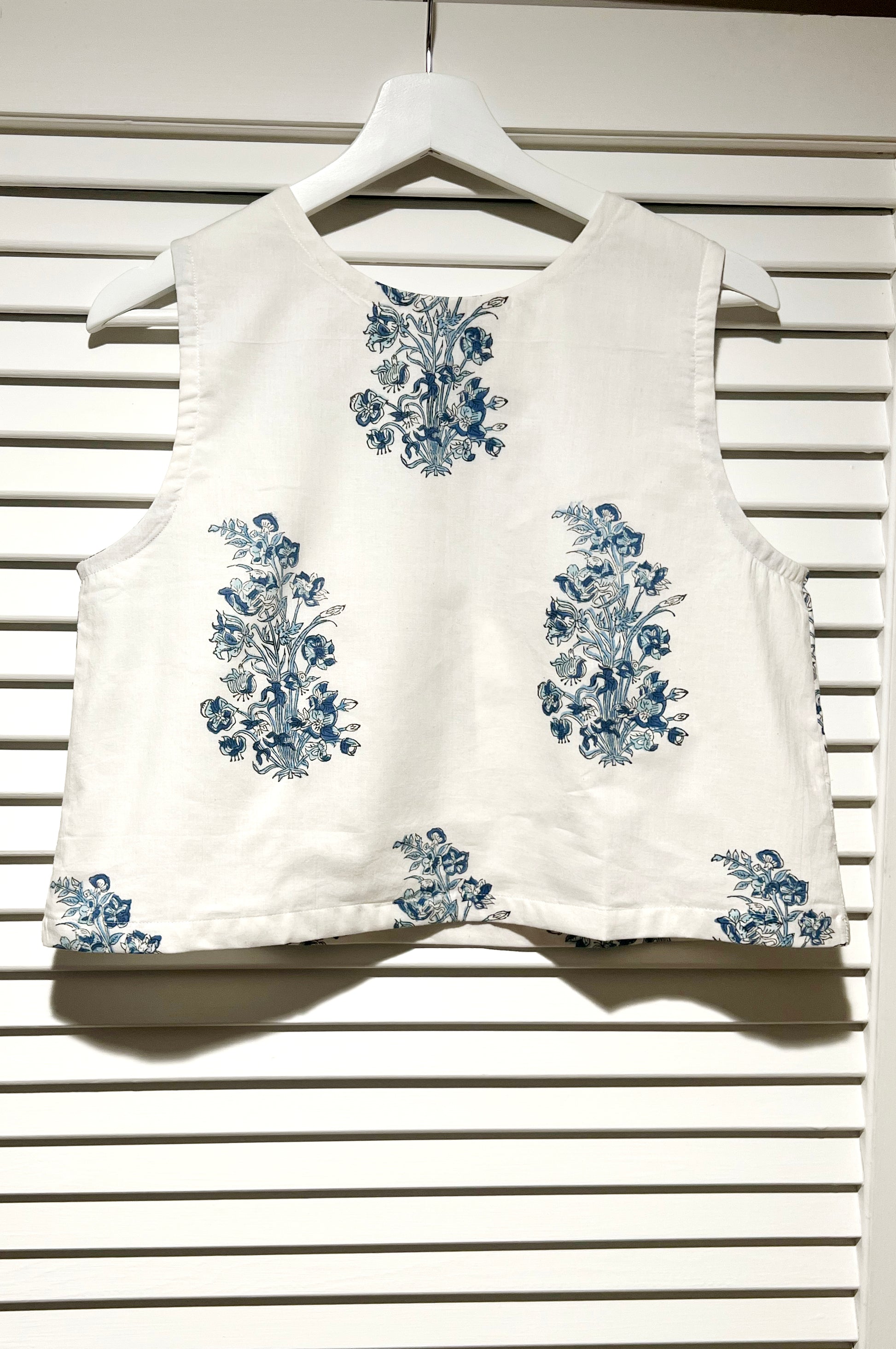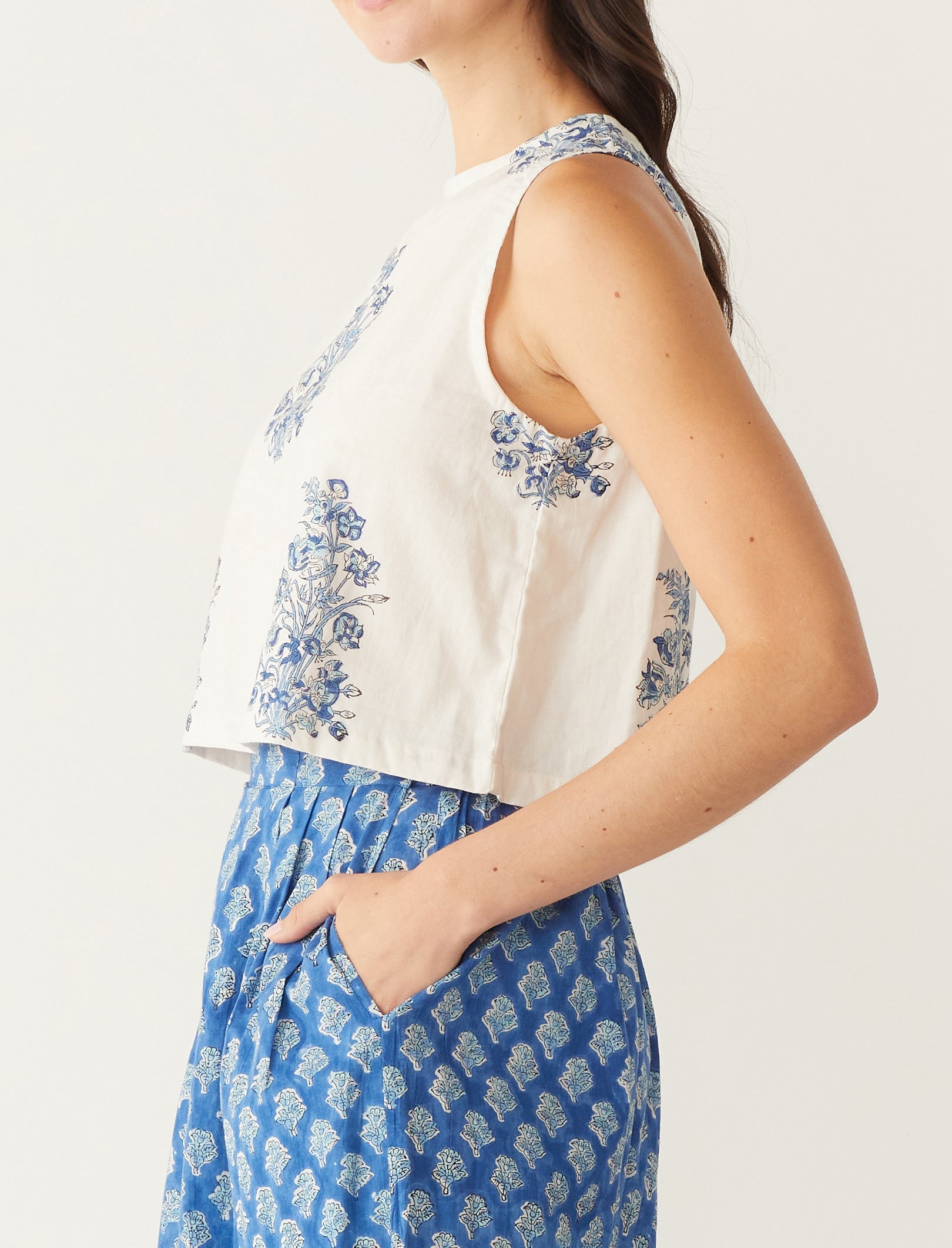 A favorite top in a block print. Perfect summer pieces for layering. Easy fit pull over top with button closure at back neck.