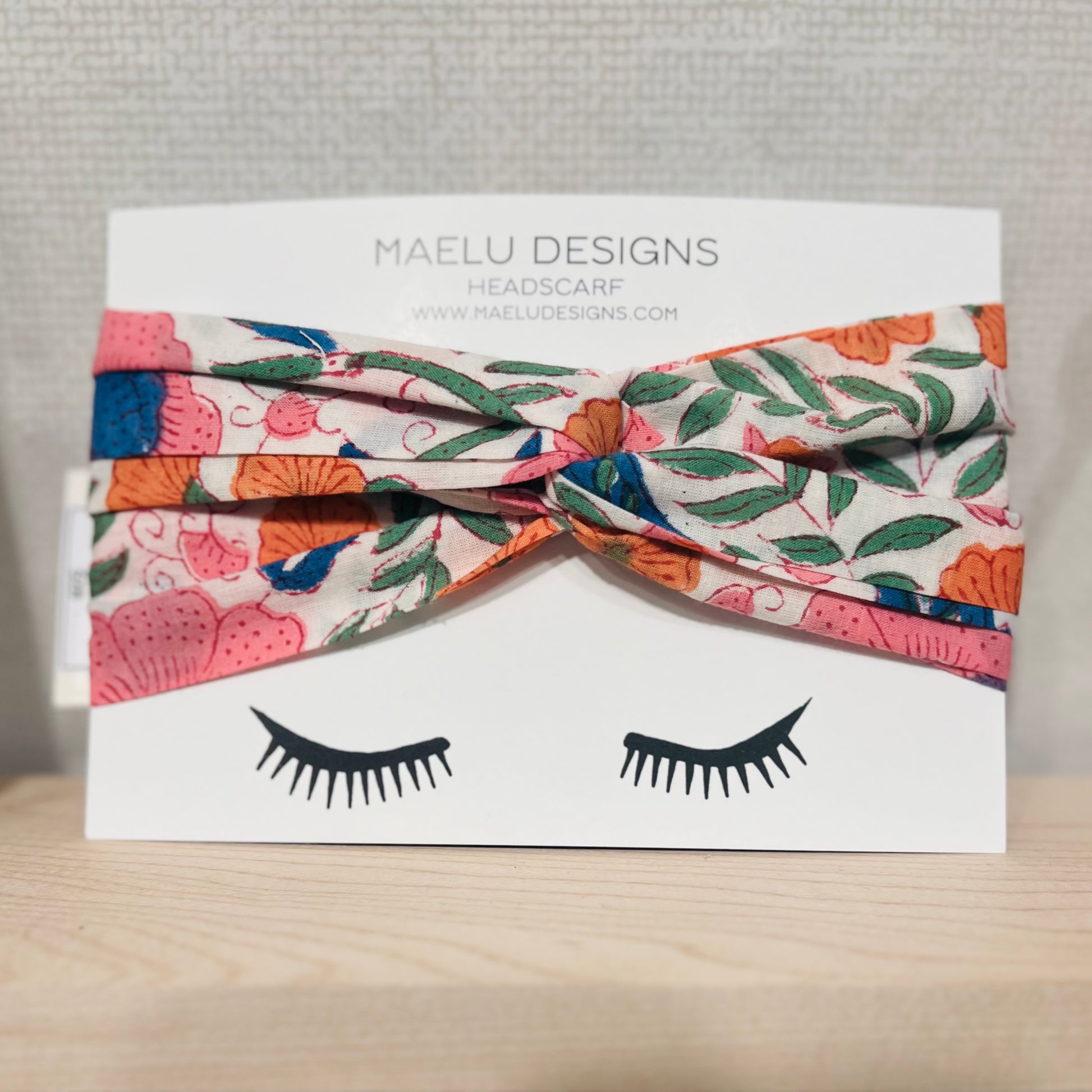 This Maelu scarf have all been individually hand block printed throughout the fabric, making each scarf completely unique. Tie your hair up in a turban headband, wrap it like a scarf or wear it like a belt. A versatile piece that pairs with Maelu Box top.