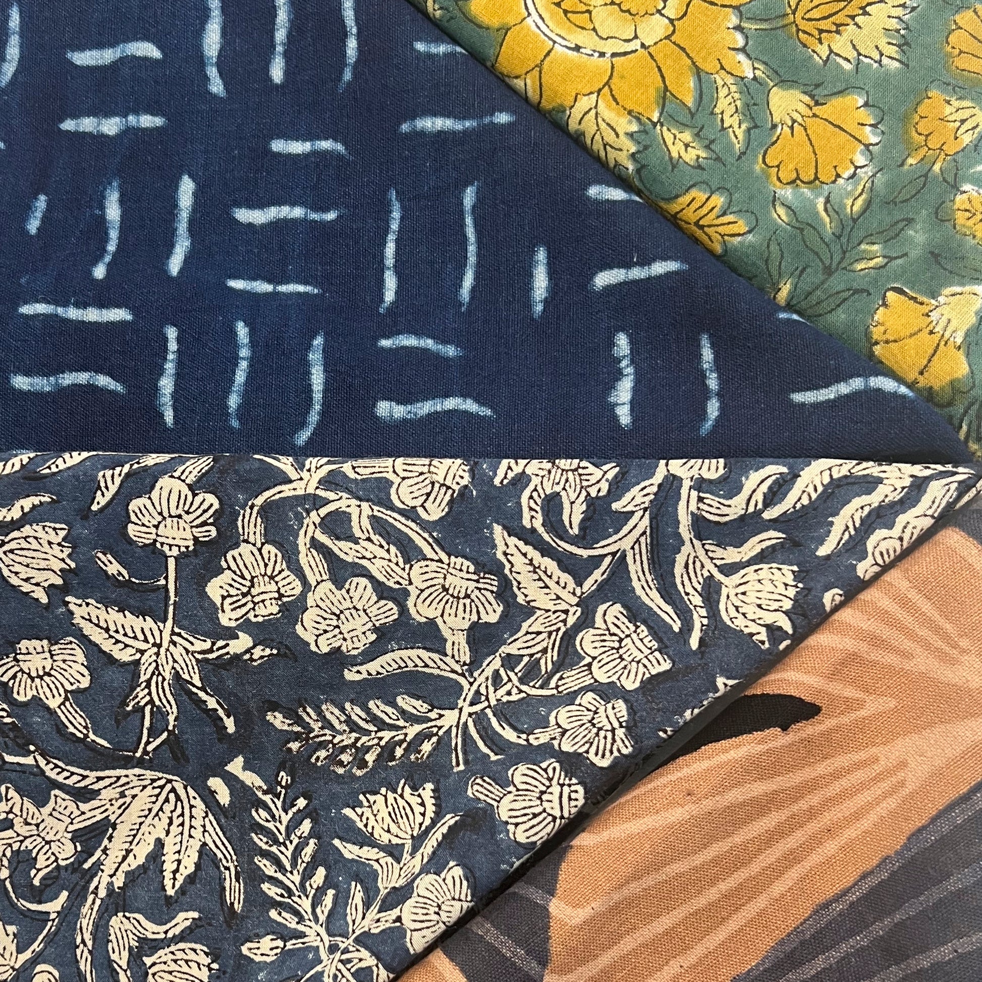 Due to the handprinted nature of block print, slight color differences and variations between fabrics are expected. These differences enhance the beauty of our textiles and are celebrated. Some natural dyes, especially indigo, may bleed and transfer. We recommend washing gently or with like colors in cold water and air drying.