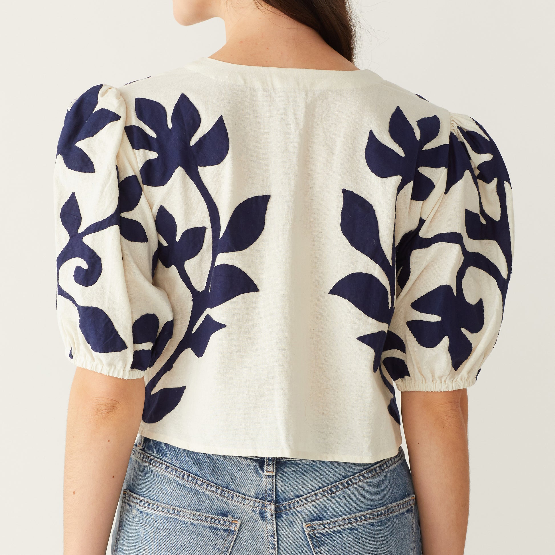 Deep Blue cotton voile applique hand stitched to the natural color textured color.