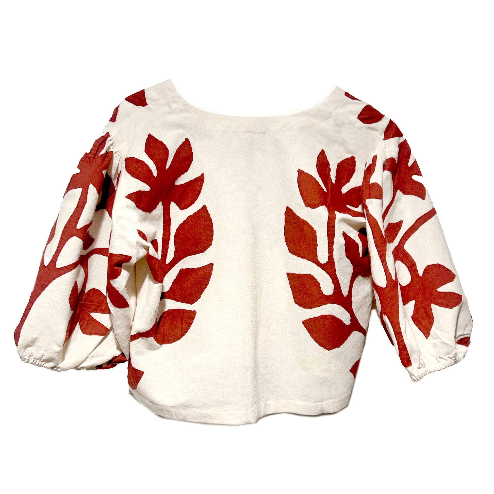 Currant cotton voile hand cut applique hand stitched to the natural color textured cotton.