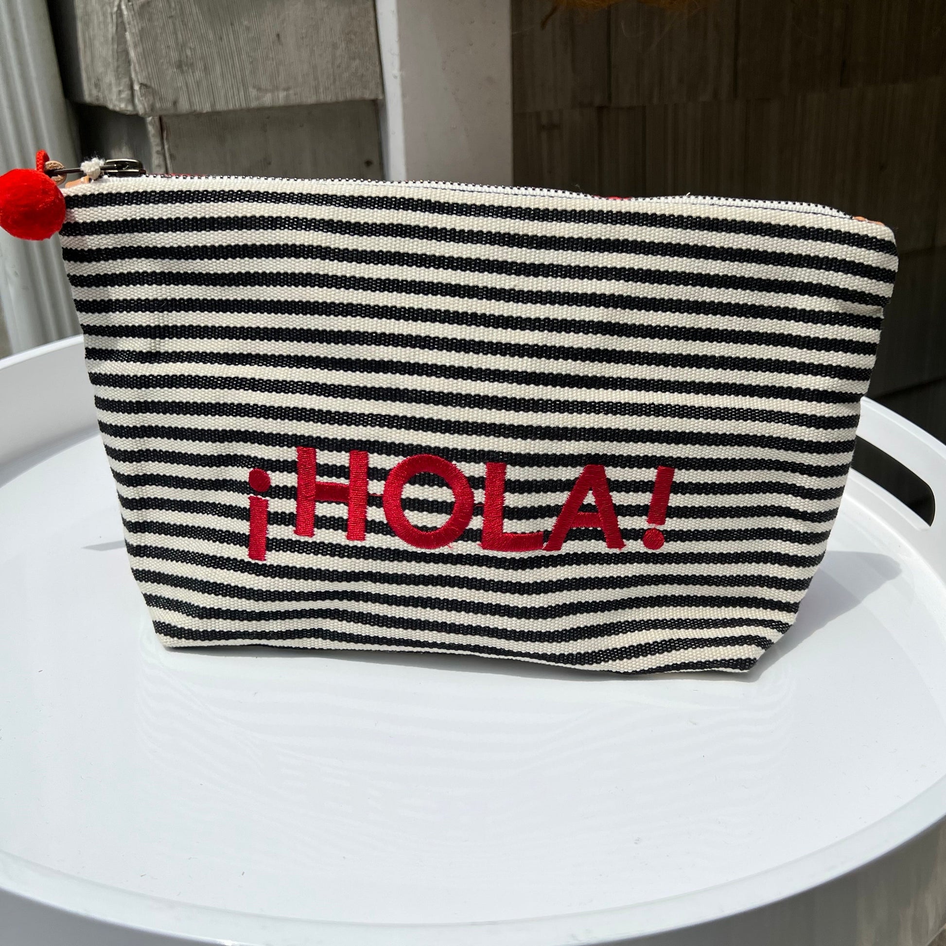 This best-selling travel pouch style fits neatly into a tote bag or luggage to organize small goods from makeup, skincare, and other small goods. Featuring water-resistant lining and leather zip pull with accent pom pom and embroidery.