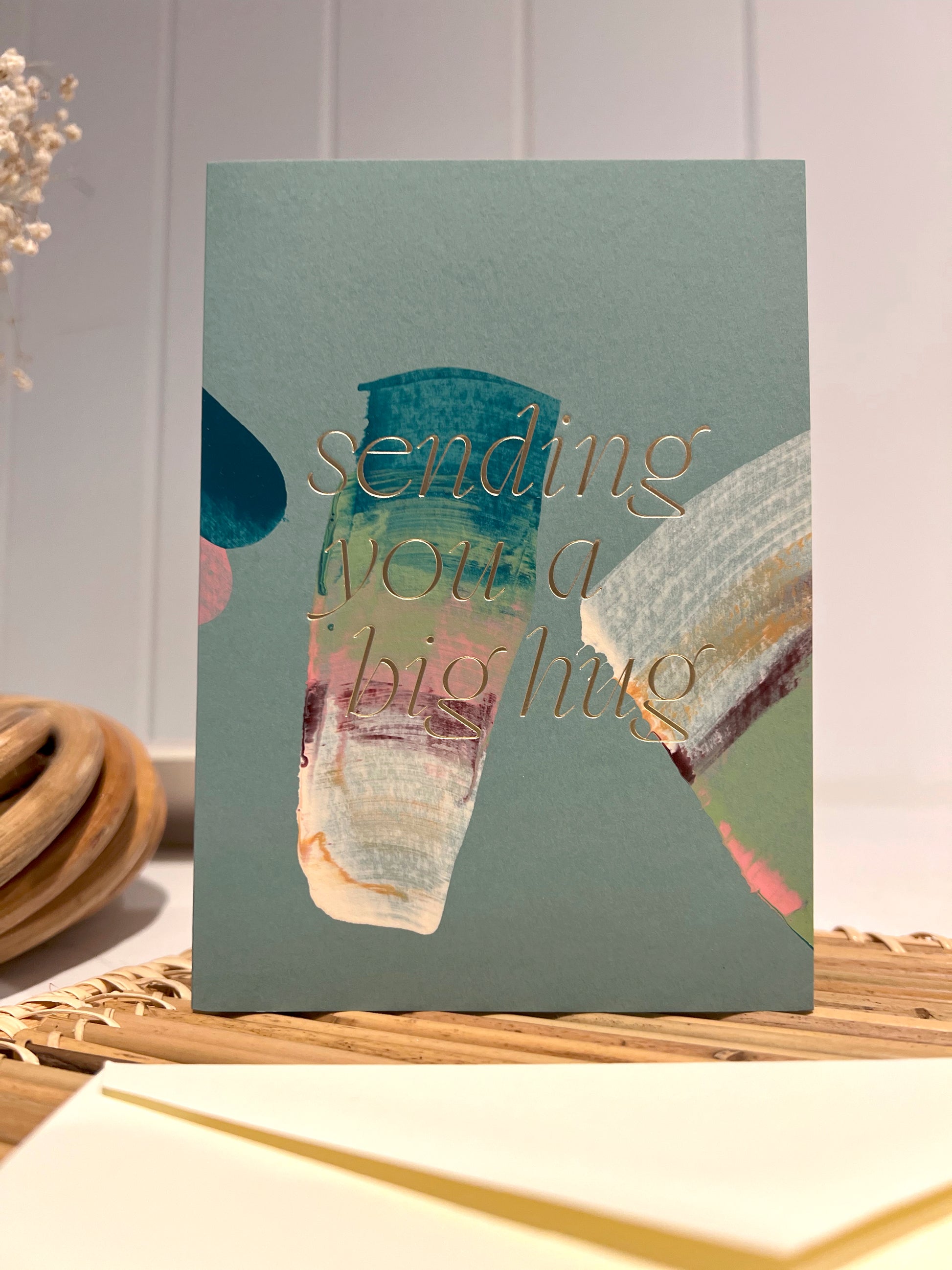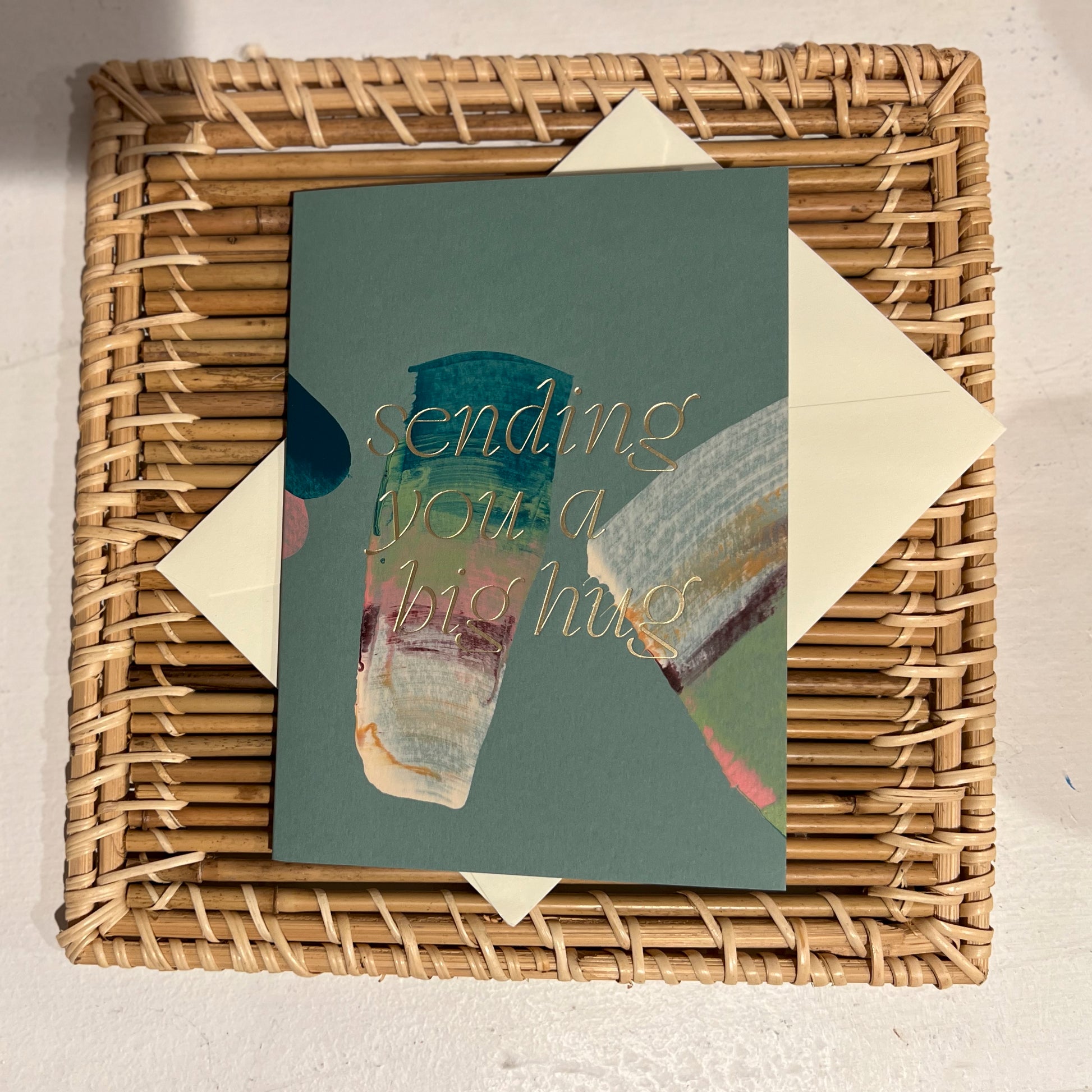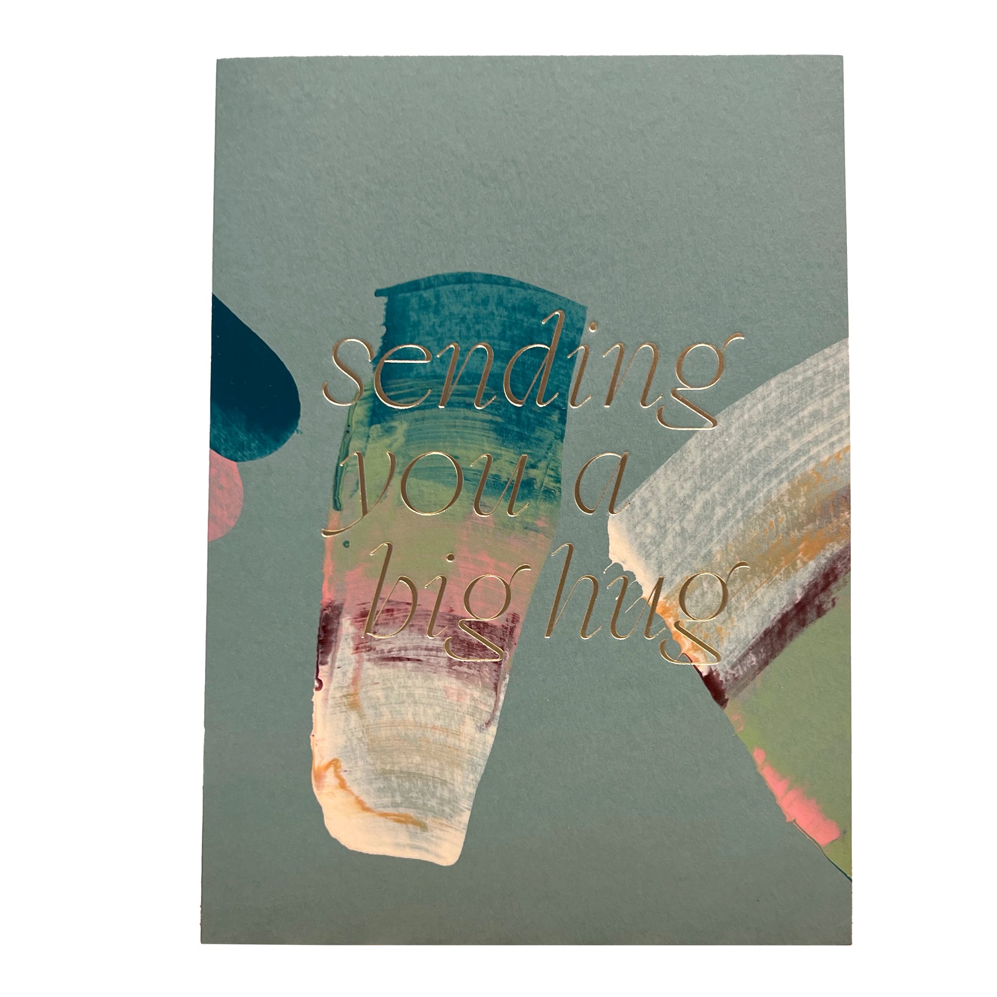 Hand painted multicolor brush strokes folded card with color foil wording. Each card has a unique abstract design and color. Paired with a white envelope.