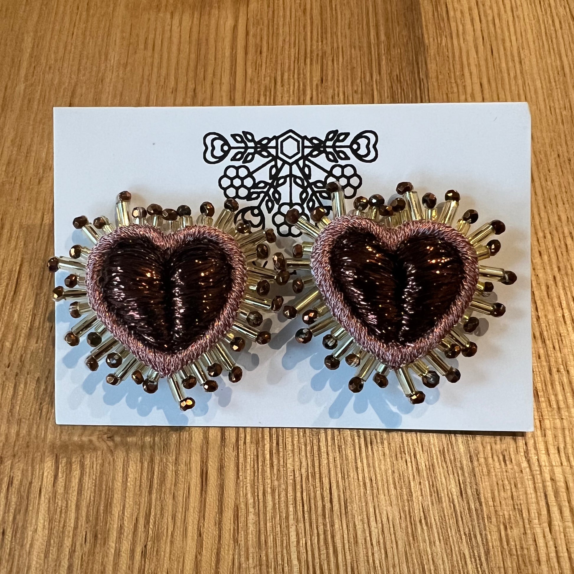 Hand embroidered heart earrings. Inspired by the sacred heart imagery found from Sicily to Mexico, these statement earrings will add sparkles to your outfit.