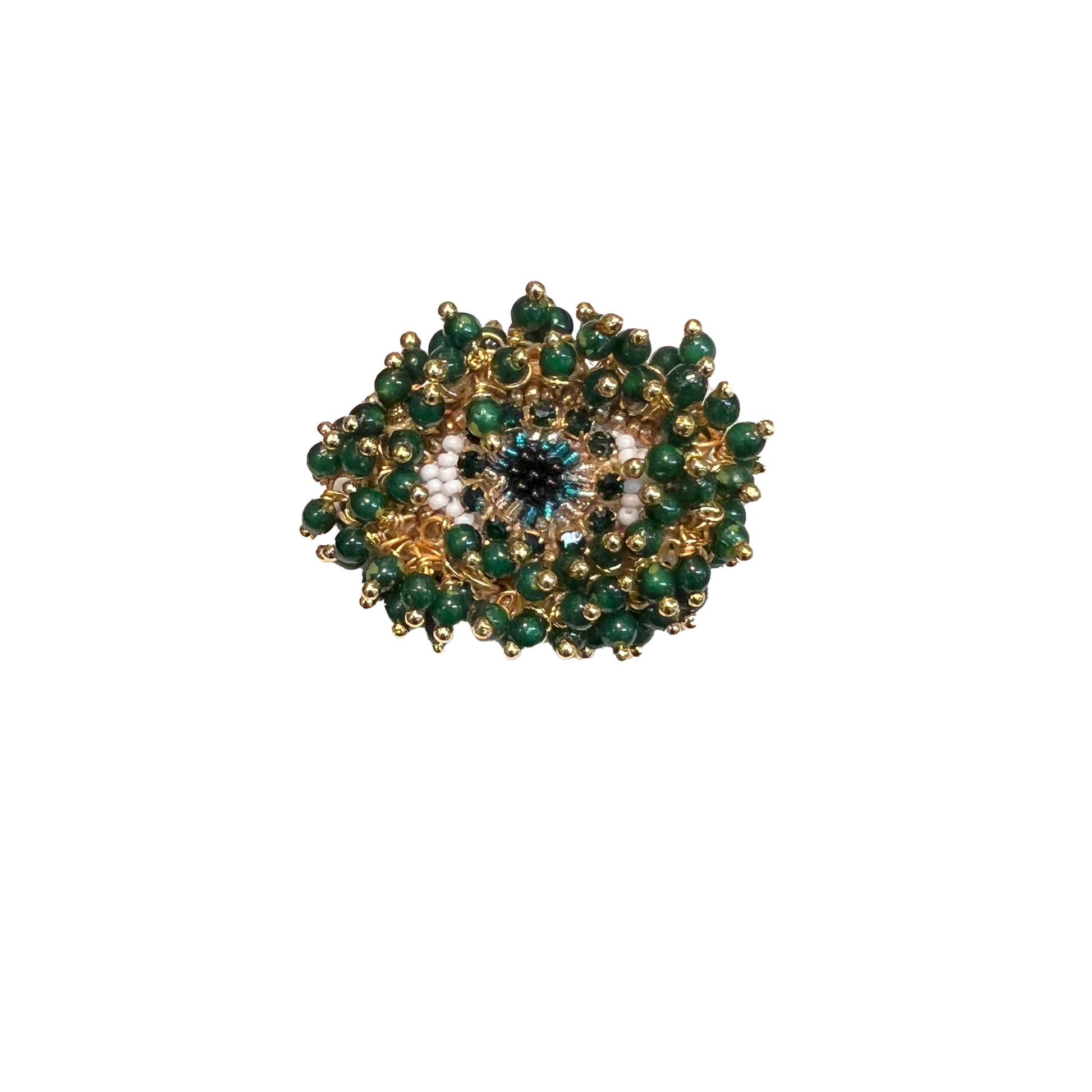 Composition : sequins, glass beads, leather backing and gold plated brass post/pin/plate.