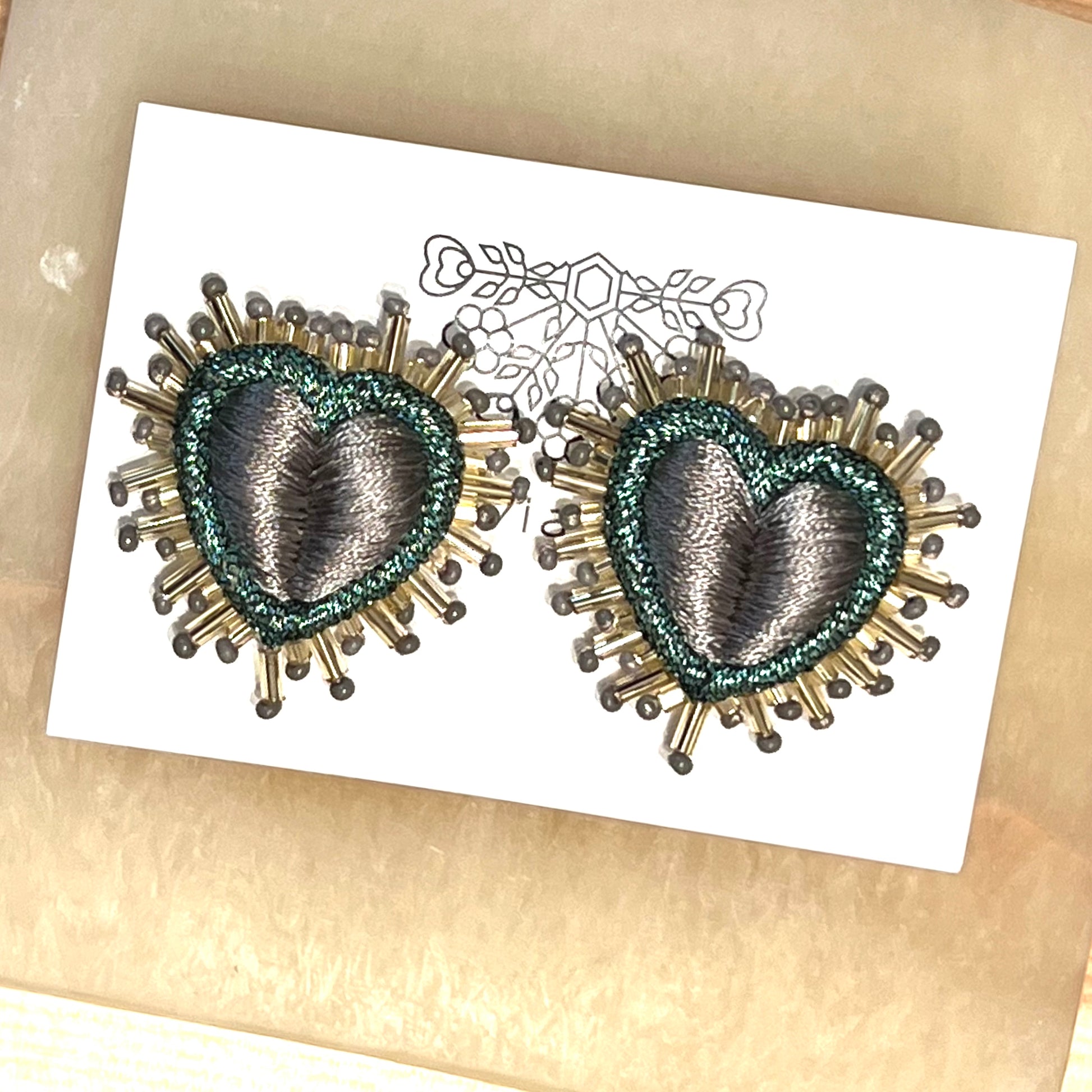 Olivia Dar Sparkle Heart Beaded Earring Pair in color Grey silk thread with Green lurex and silver tone bugle beads.