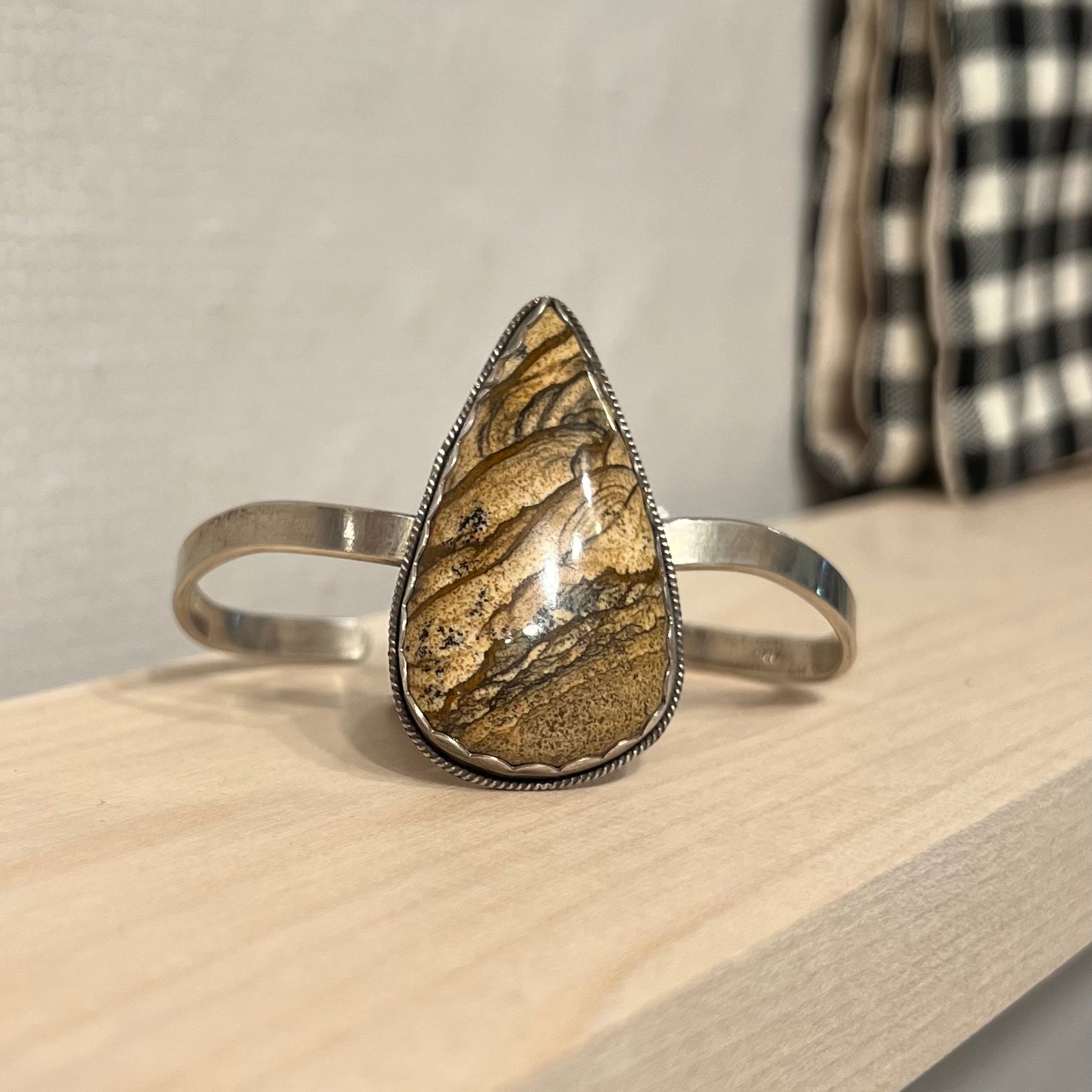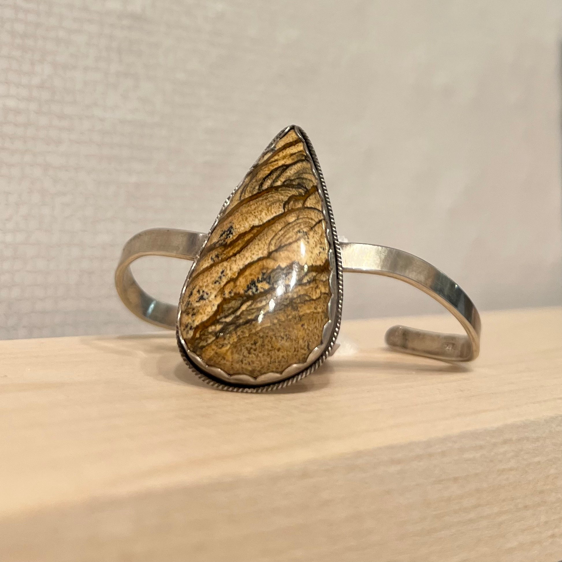 Sculptural Silver cuff bracelet with a petal shaped stone.