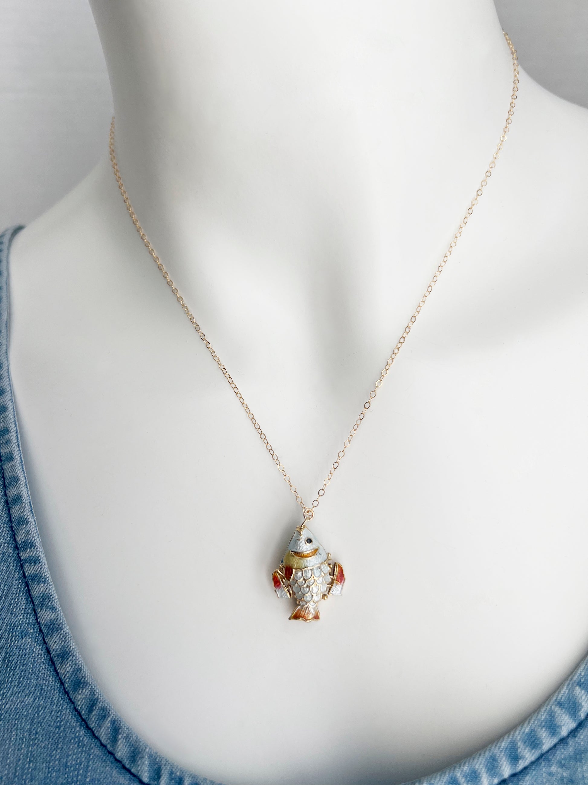 Stone Cooper Cloisonne fish charm with gold fill necklace.