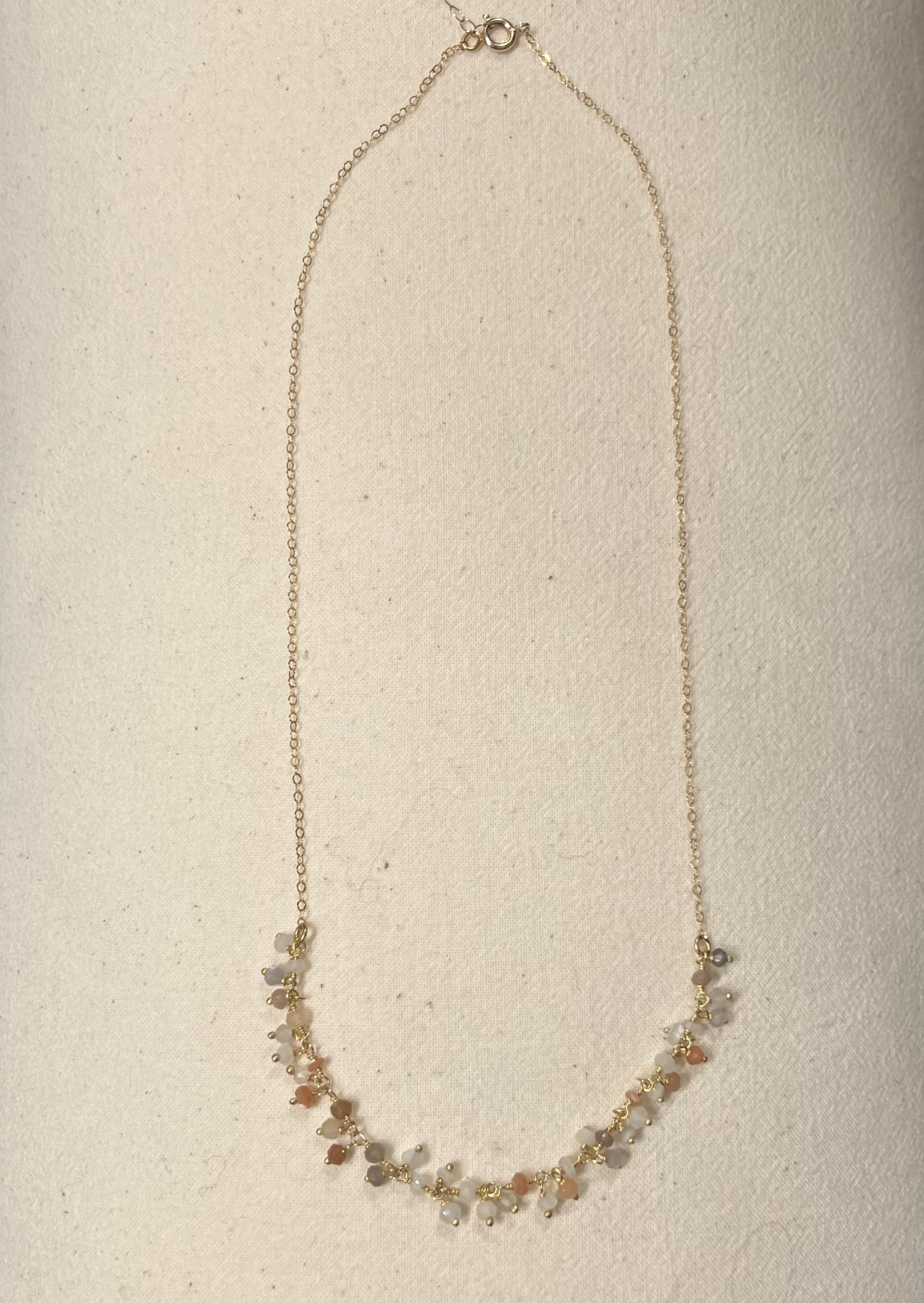 Stone Cooper Moonstone droplet beads with gold fill necklace. A lovely piece for any jewelry collection. Subtle sparkle to wear on its own. Yet this piece is understated to layer it with other necklaces to match your individual style. Natural stones with the benefits of gold fill combined to create this stylish and timeless piece.