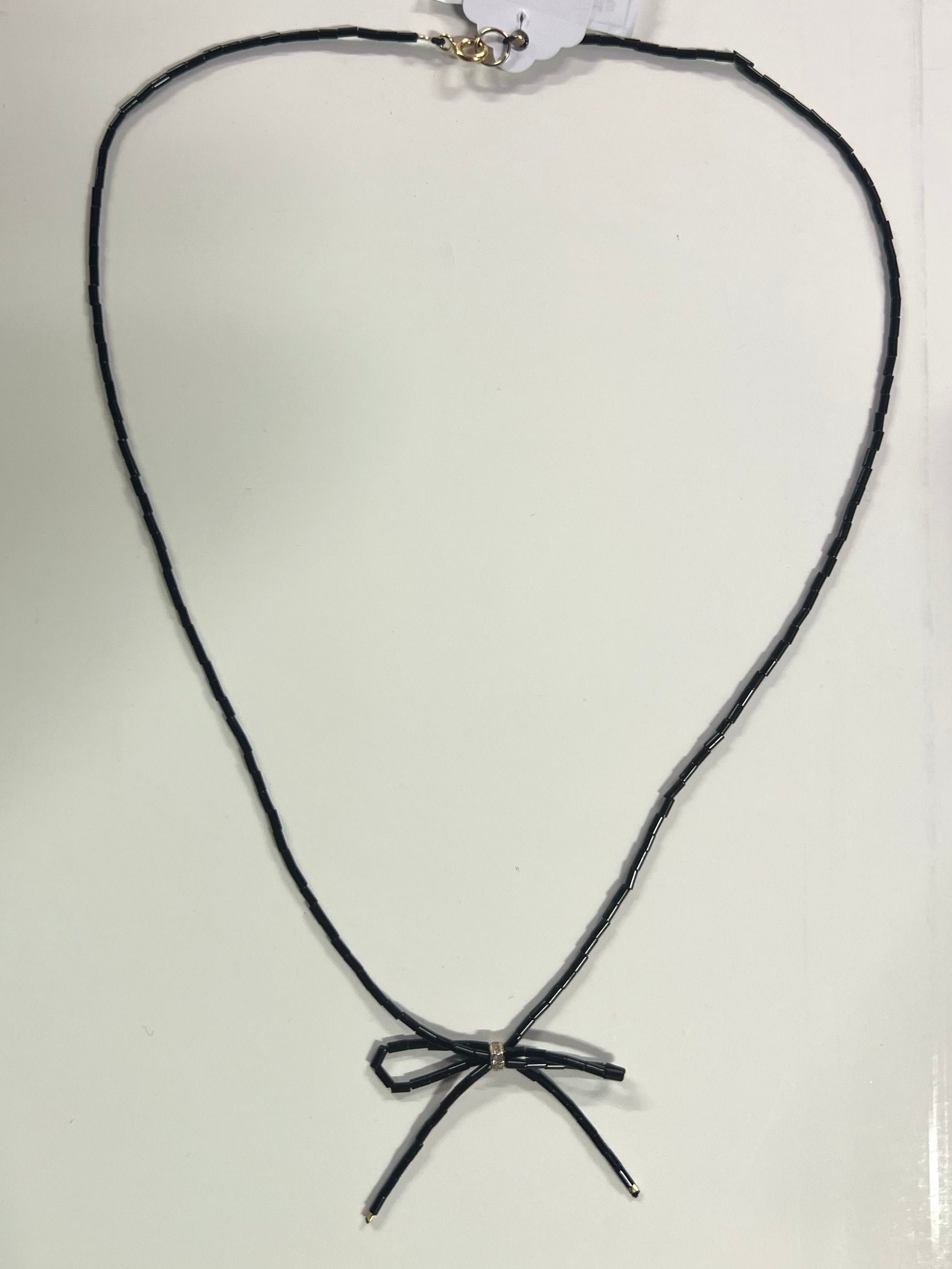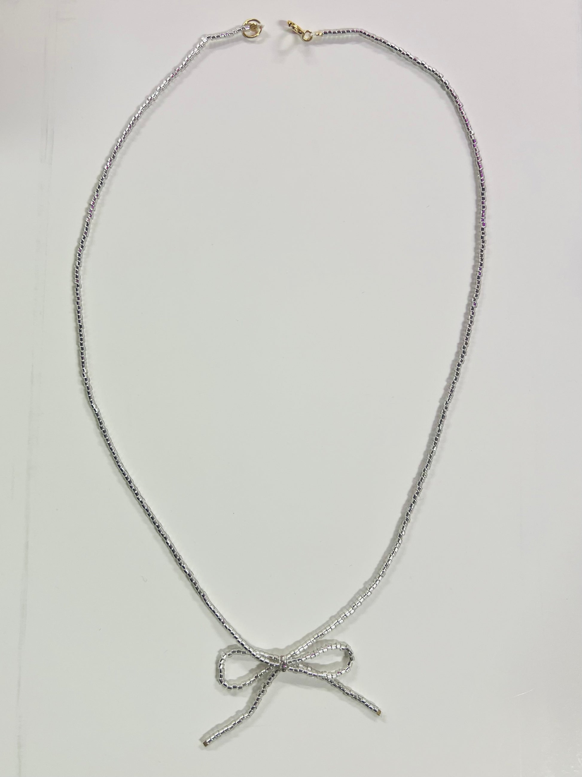 The Swellife bowtie necklace is dainty and is easily worn on its own or stacked with other necklaces. Tiny glass seed beads create this 18" long necklace. You can select their signature matte vermillion red, or shiny silver. The center of the bow and finishing either gold, or a sparkly rhinestone center.